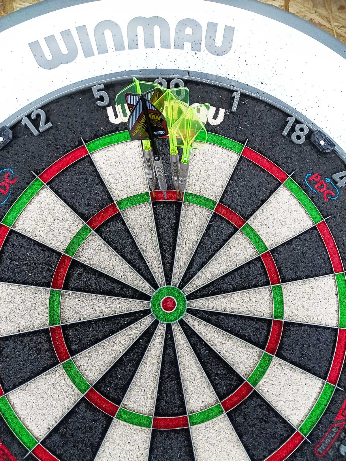 Eingedrückt wurden hier die 50mm Spitzen. Getestet werden derzeit lange Flights in verschiedenen Formen. Diese Peter Wright Darts gab es auch im Weihnachtskalender in der 22g Version.