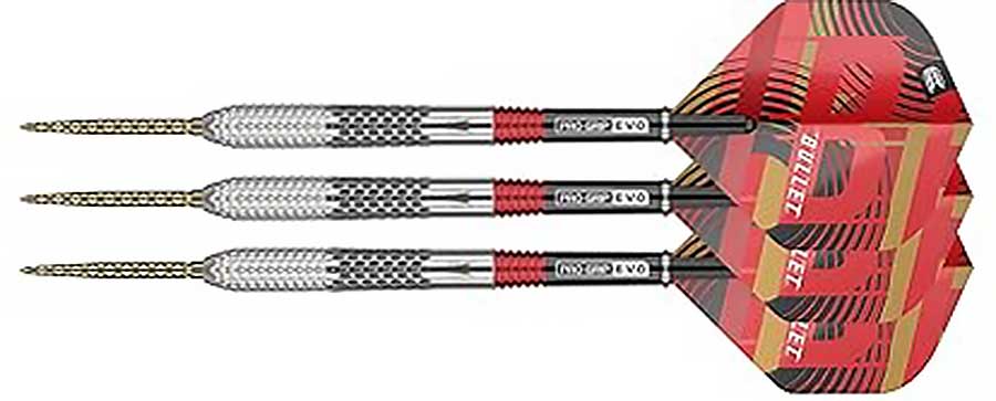 Mit Flights und Spitze kann man noch 1,5 bis 2 Gramm dazu addieren. Ich spiele derzeit die Stephen Bunting Darts in der 13 Gramm Version von Target mit den eindrehbaren Spitzen (SwissPoint). Hierzu habe ich mit kleine Gewichte zugelegt, um ein passendes Gesamtgewicht für mich zu ermitteln. Die Gewichte werden am Barrel angeschraubt und daran der Schaft mit dem Flight.