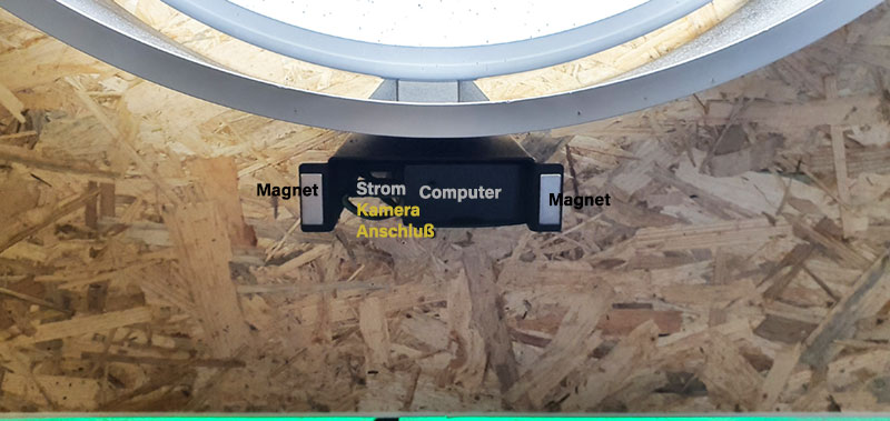 Linkes Bild zeigt unten linke die Mehrfachsteckdose. Angeschlossen sind Solia, Lichterkette, Lichtring, LAN und Mini PC. Daneben 3 Umschalter und der Mini PC.