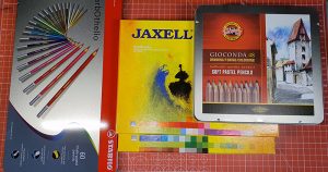Interessant finde in in diesem Zusammenhang die Verwendung von Pastellkreide. Dies hatte ich noch gar nicht auf dem Schirm! Gar nicht? Vor vielen Jahren muss ich wohl Interesse gehabt haben, denn ich habe eine gute Ausstattung gefunden. Spezielles Pastellkreidepapier in mehreren Farben A2 – Pastell Stifte-Set 48 Gioconda / Stabilo Pastellkreidestifte CarbOthello 60er Set und 2 Kästen a 36 Jaxell Pastellkreidestücke. So wie es derzeit aussieht, werde ich im Herbst bei Roland Kuck weiter machen. Dann kann all dies weiter ausgebaut werden. Nachtrag: Ich glaube, dass ich auch das passende Papier dazu gefunden habe: 20 Blatt CANSON MI-Teites Sortiment 50×65 cm , dunkel.