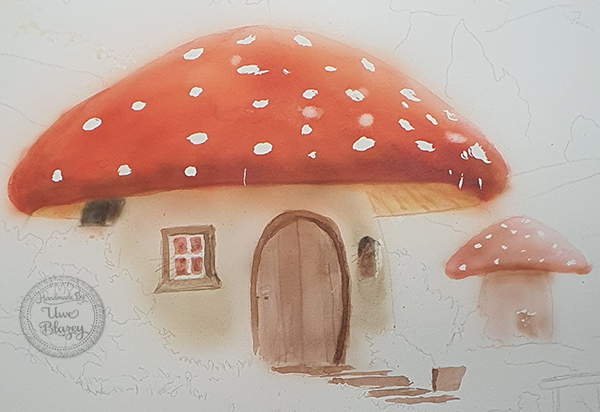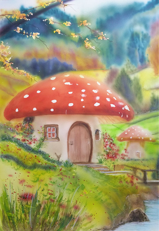 Dies ist ein Teilausschnitt der Übung. Ich habe hier mit Maskier-Flüssigkeit gearbeitet. Dies war meiner Meinung nach ein großer Fehler. Die weißen Flecken auf dem Pilz sehen nicht schön aus. Da muss ich mir etwas Anderes einfallen lassen! Diese rötlichen Kreise habe ich durch Herauswaschen erzeugt. Die weißen Fensterrahmen habe ich mit dem Airbrush ausgeblasen. Dies war zu heftig, da schwarze „Spinnenbeine“ entstanden sind. Soweit der derzeitige Stand. Bevor das Bild endgültig in den Papierkorb wandert, werde ich die Waldlandschaft üben. Diese liegt oberhalb des Pilzes. Leider habe ich auch hier bereits mit Maskier-Flüssigkeit gearbeitet.